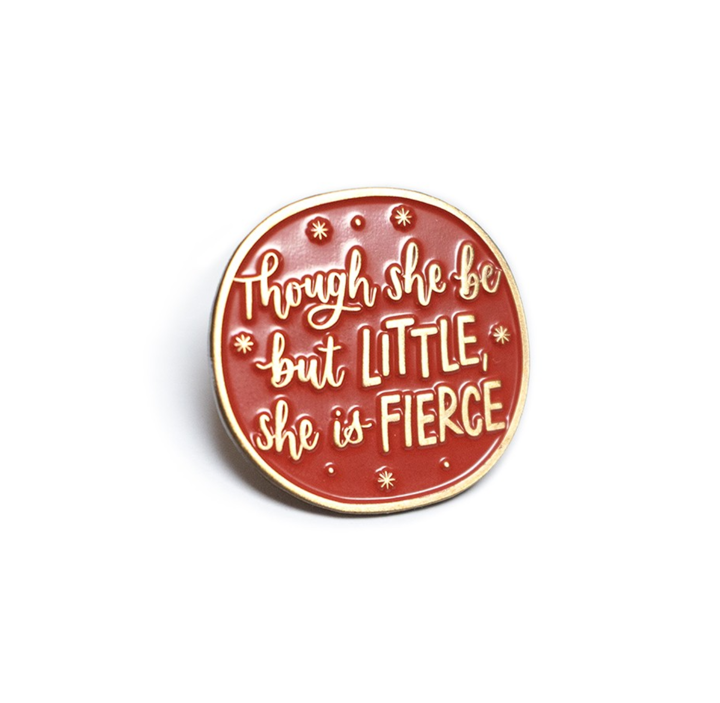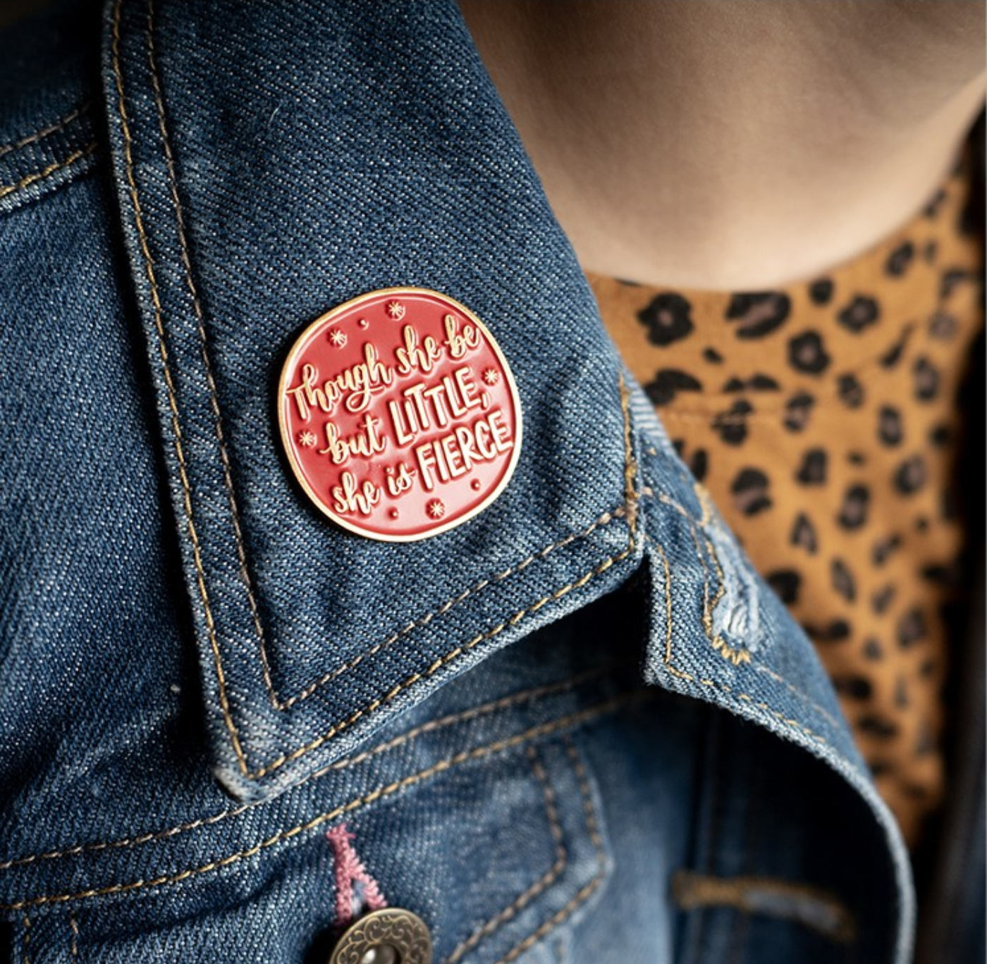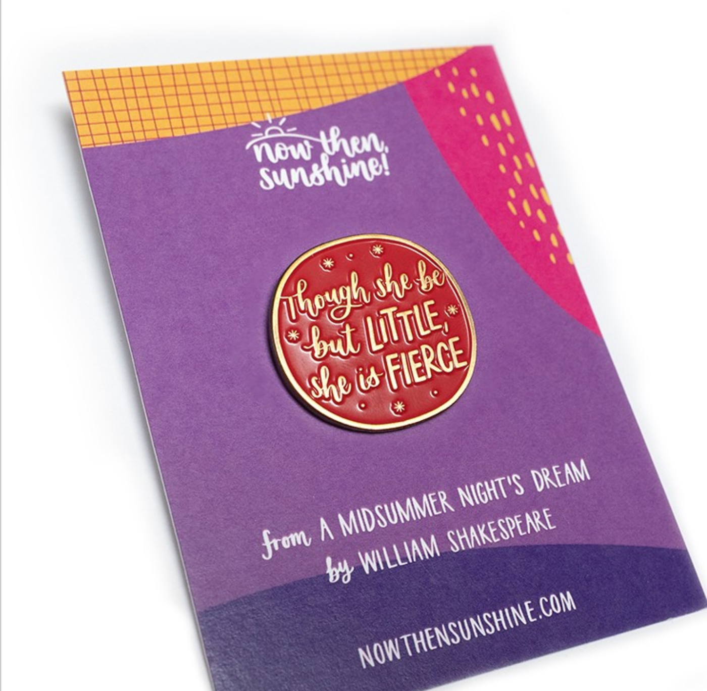A bright and colourful pin badge featuring a quote from Shakespeare's A Midsummer Night's Dream.