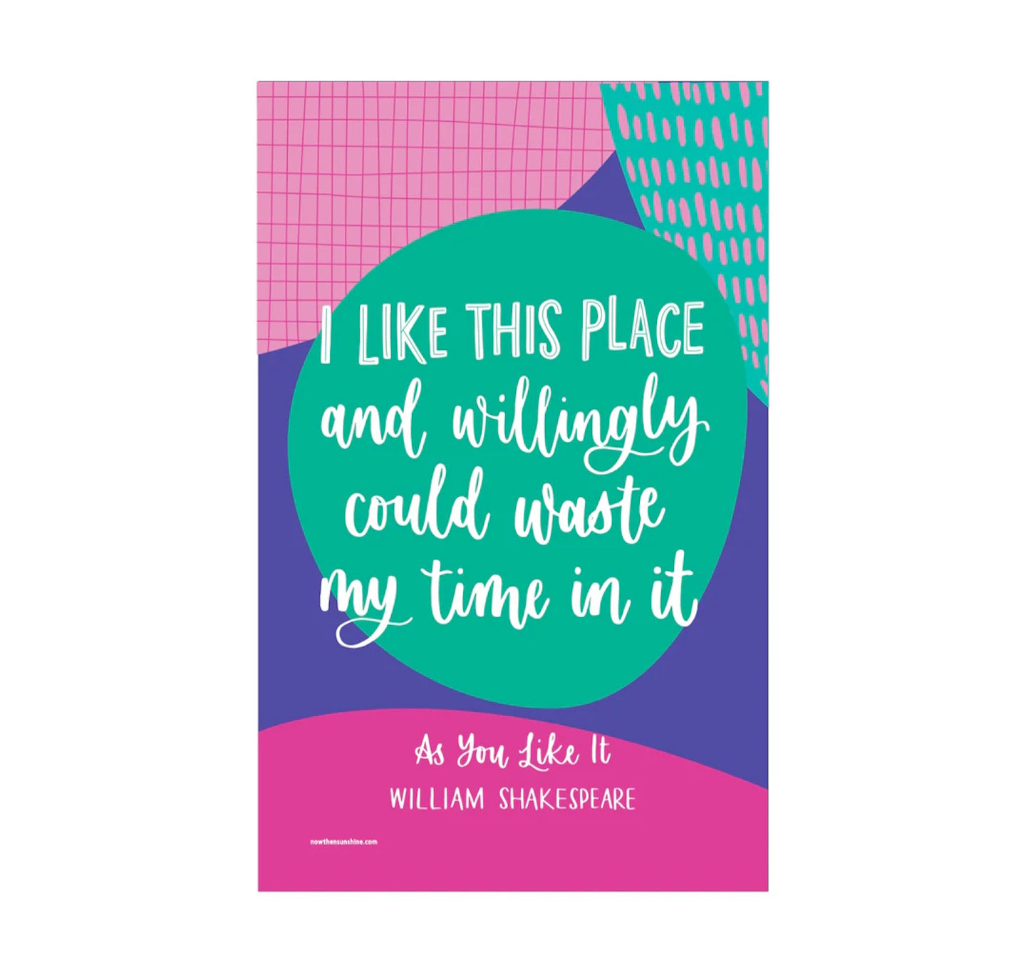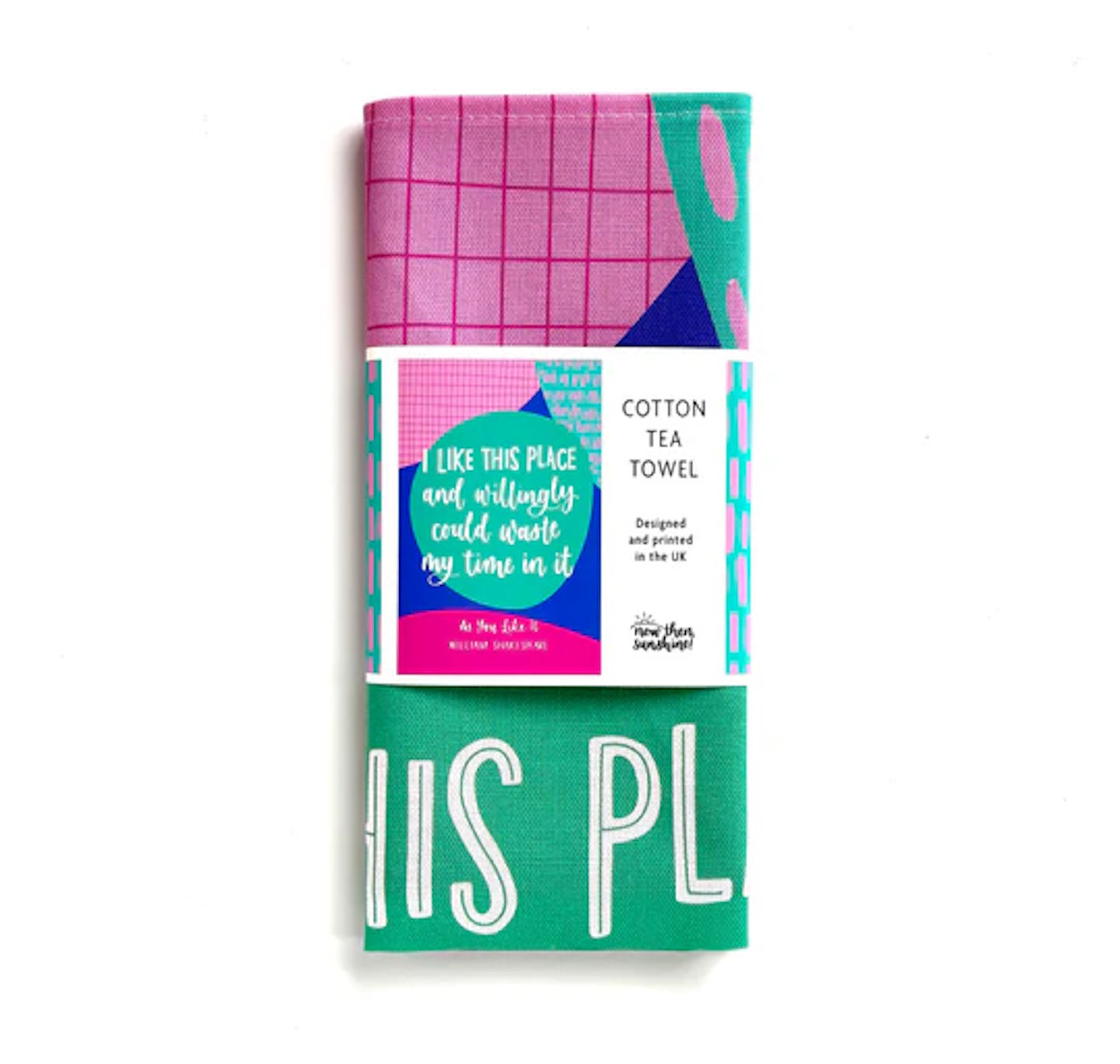 A fun Shakespeare-inspired tea towel featuring the quote "I like this place and willingly could waste my time in it" from the play As You Like It - ideal for adding a fun vibe to your kitchen or sending to a friend.